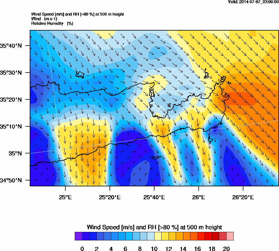 Graph 2: arw002.png - Wind Speed [m/s] and RH [>80%] at 500 m height