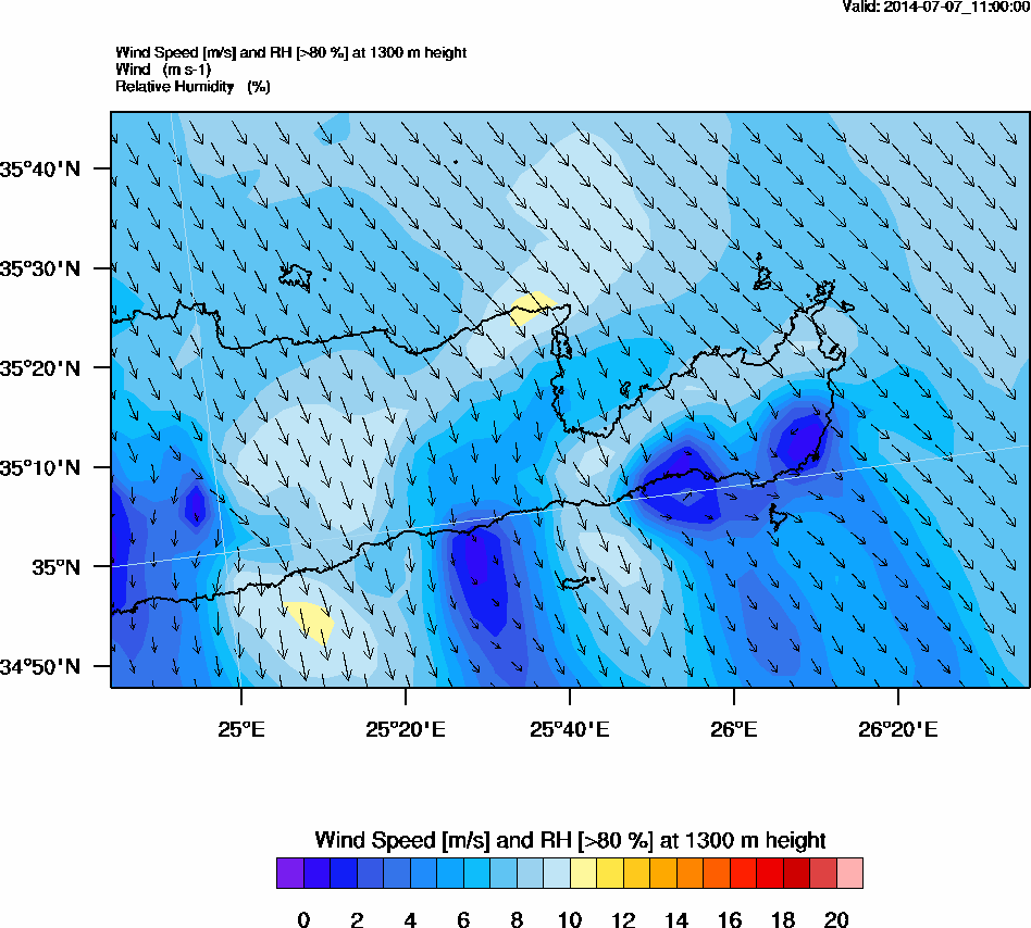 Graph 4: arw044.png - Wind Speed [m/s] and RH [>80%] at 1300 m height