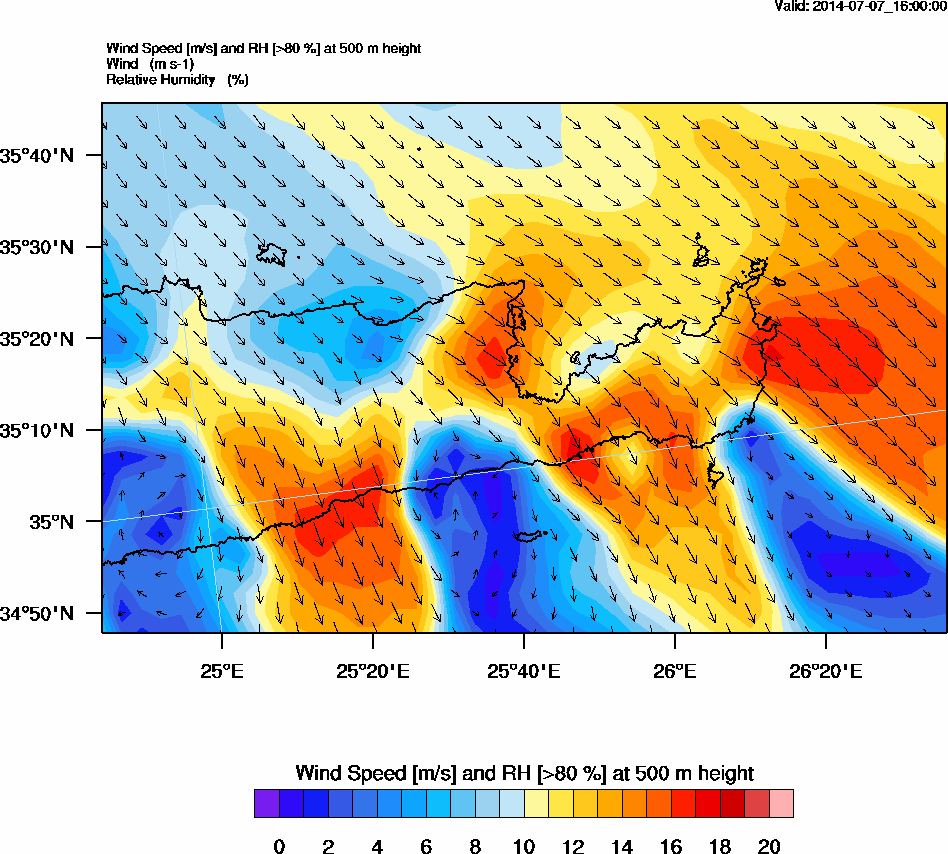 Graph 2: arw067.png - Wind Speed [m/s] and RH [>80%] at 500 m height