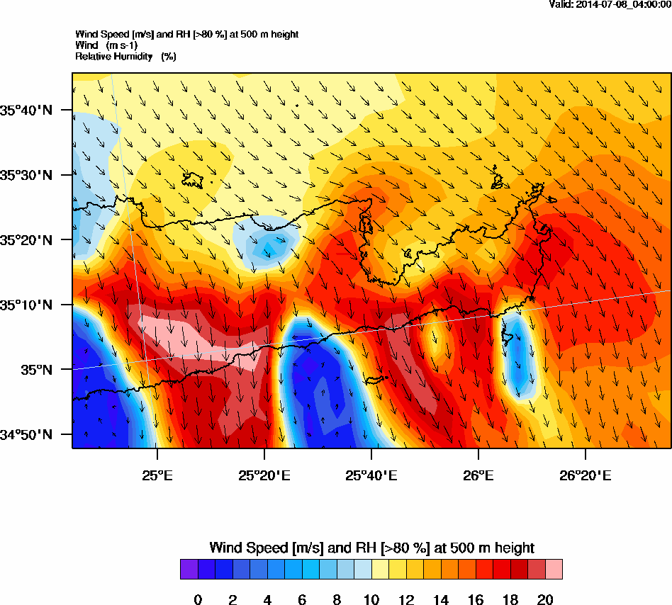 Graph 2: arw007.png - Wind Speed [m/s] and RH [>80%] at 500 m height