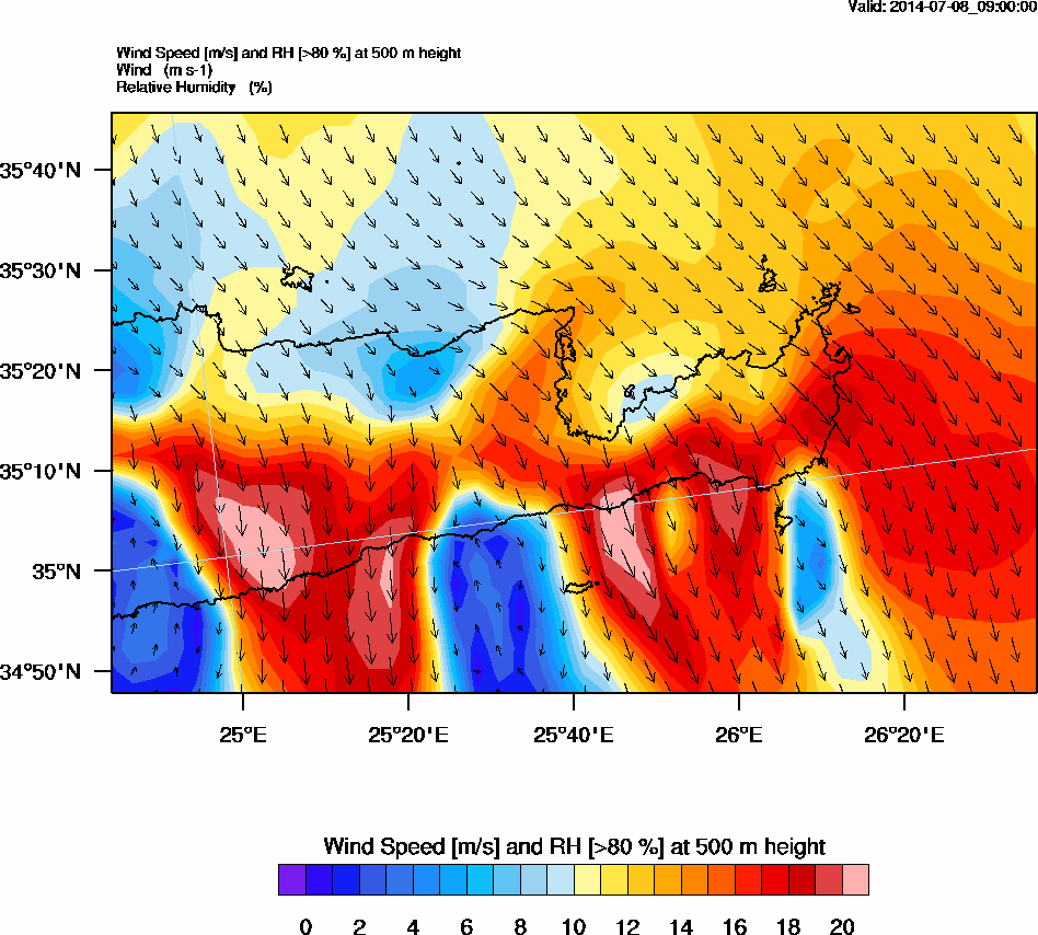 Graph 2: arw032.png - Wind Speed [m/s] and RH [>80%] at 500 m height
