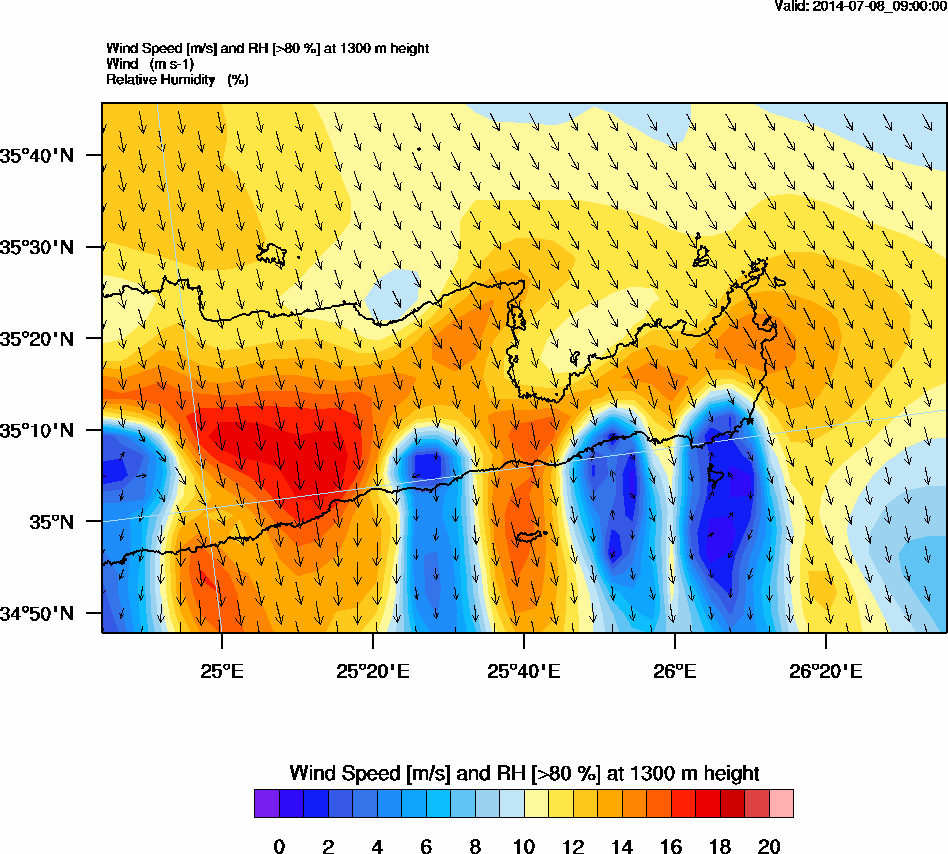 Graph 4: arw034.png - Wind Speed [m/s] and RH [>80%] at 1300 m height