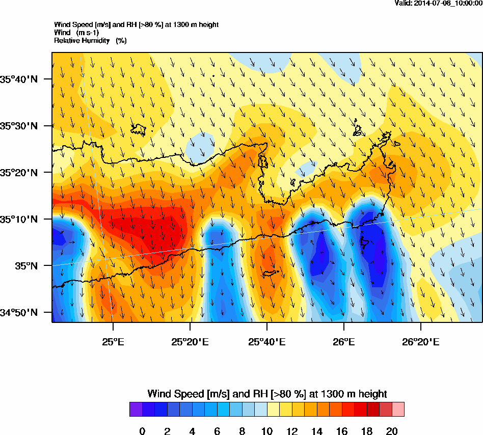 Graph 4: arw039.png - Wind Speed [m/s] and RH [>80%] at 1300 m height