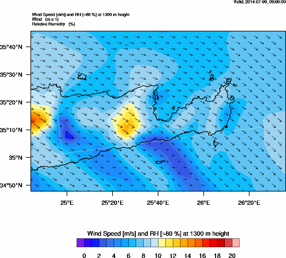 Graph 4: arw034.png - Wind Speed [m/s] and RH [>80%] at 1300 m height