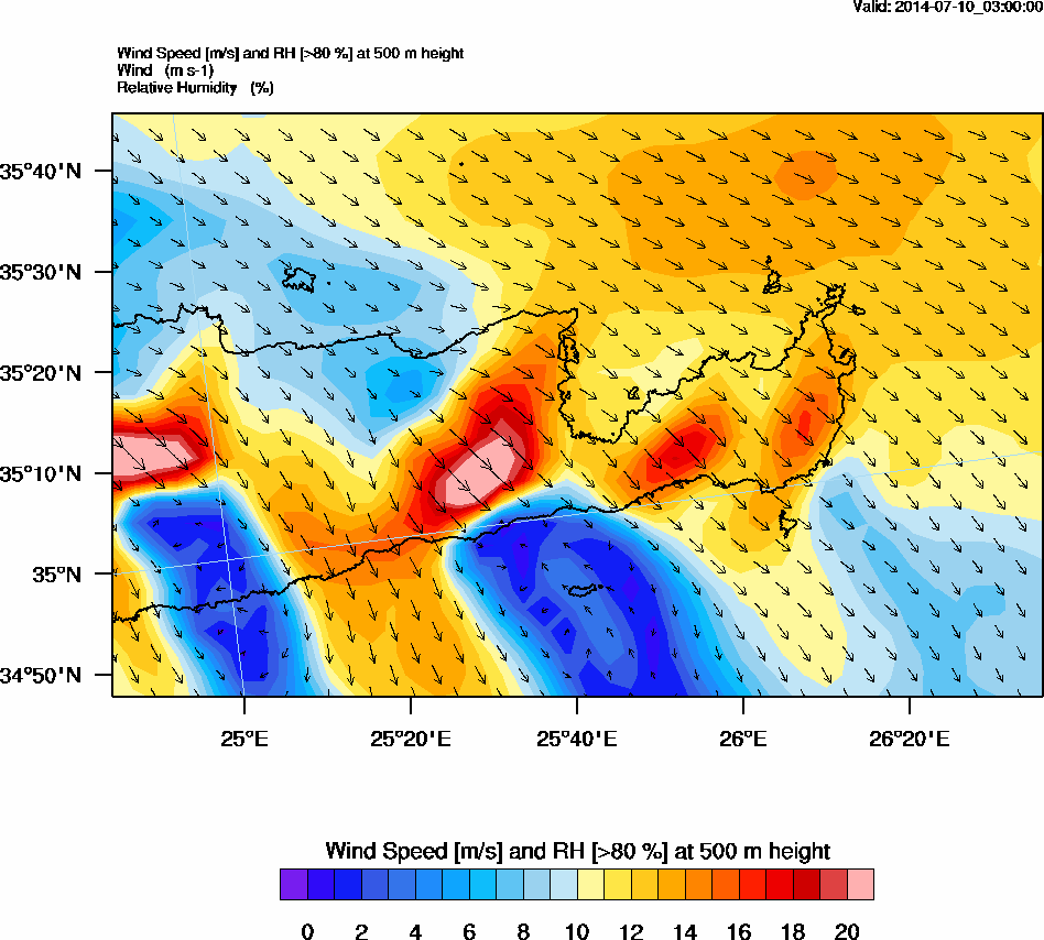 Graph 2: arw002.png - Wind Speed [m/s] and RH [>80%] at 500 m height