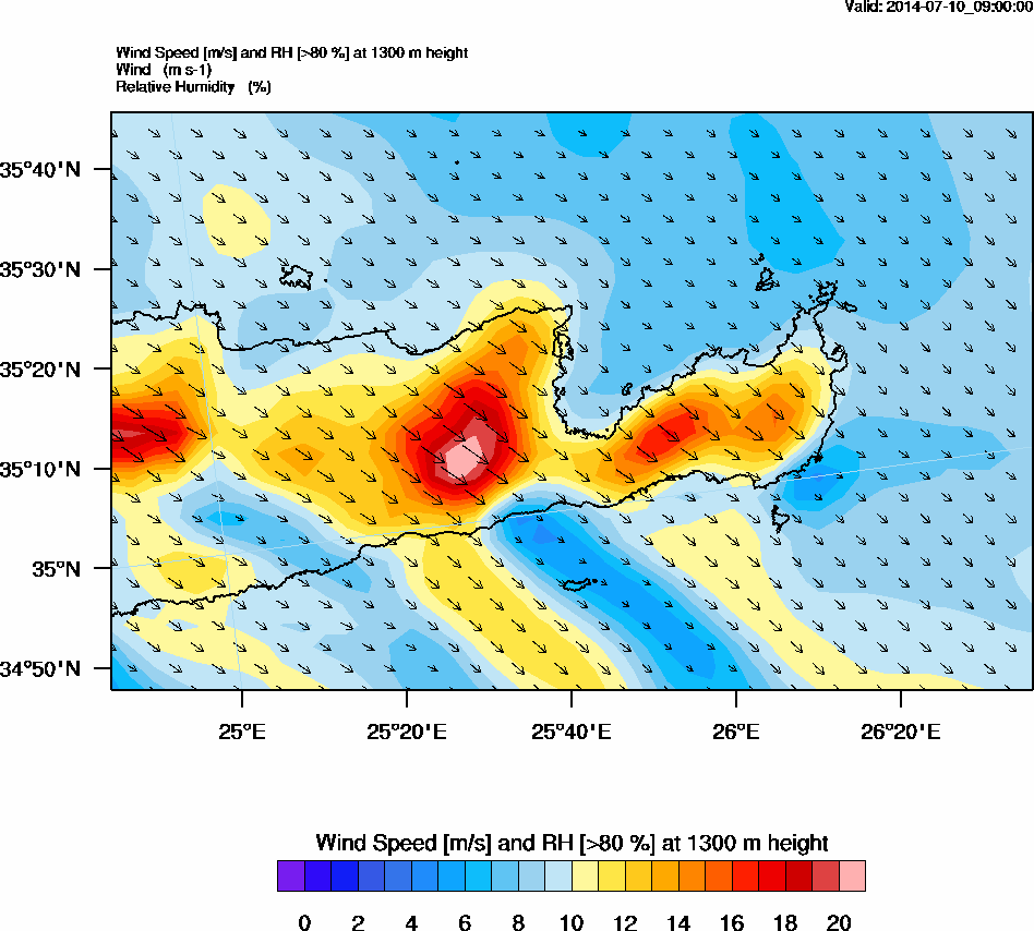 Graph 4: arw034.png - Wind Speed [m/s] and RH [>80%] at 1300 m height