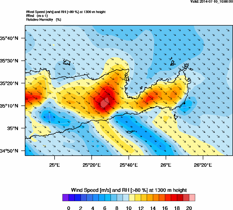 Graph 4: arw039.png - Wind Speed [m/s] and RH [>80%] at 1300 m height