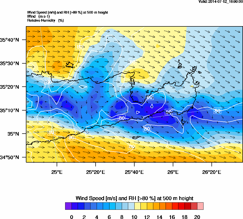 Graph 2: arw067.png - Wind Speed [m/s] and RH [>80%] at 500 m height