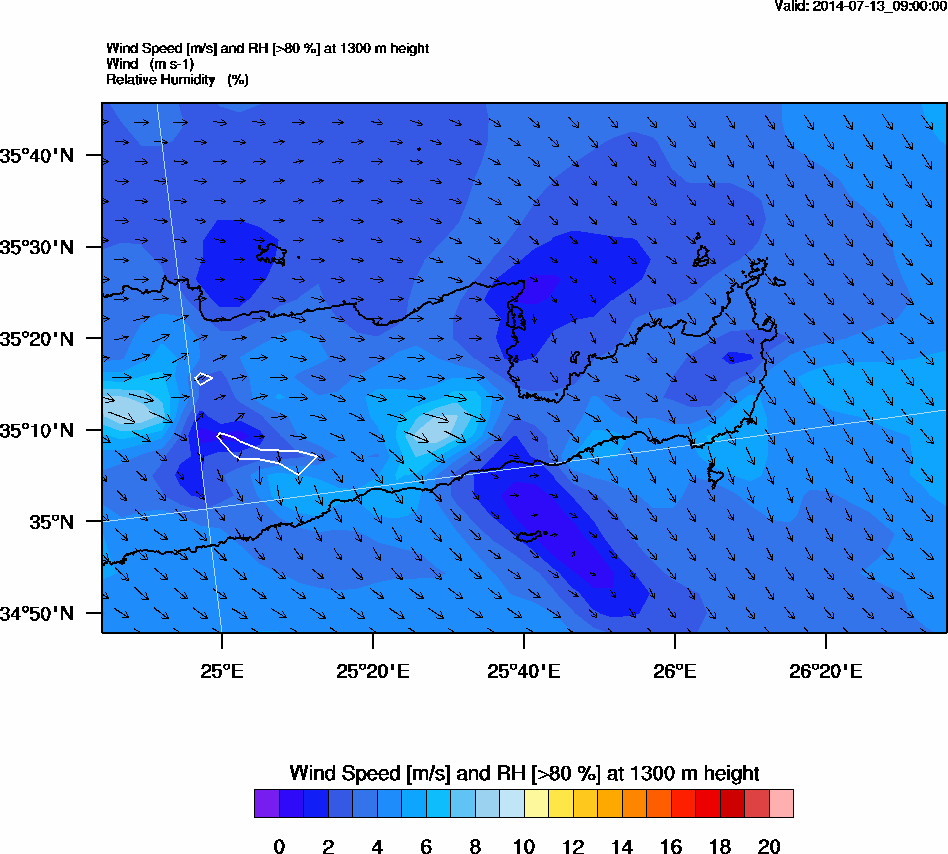 Graph 4: arw034.png - Wind Speed [m/s] and RH [>80%] at 1300 m height