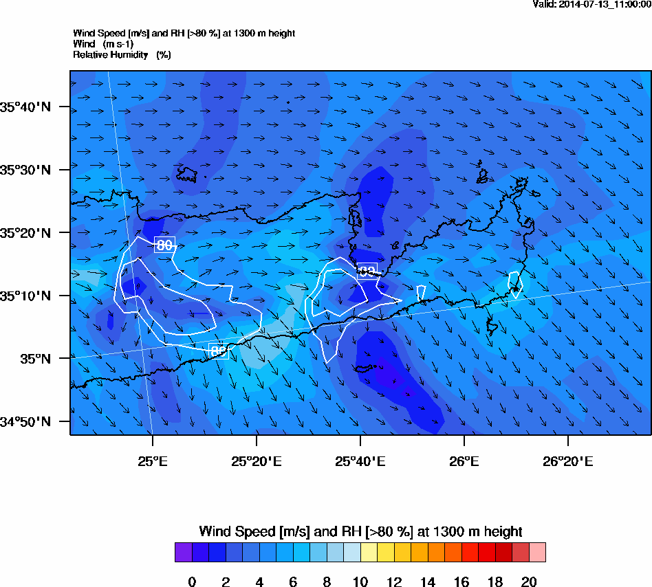 Graph 4: arw044.png - Wind Speed [m/s] and RH [>80%] at 1300 m height