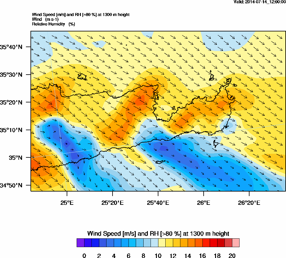 Graph 4: arw049.png - Wind Speed [m/s] and RH [>80%] at 1300 m height