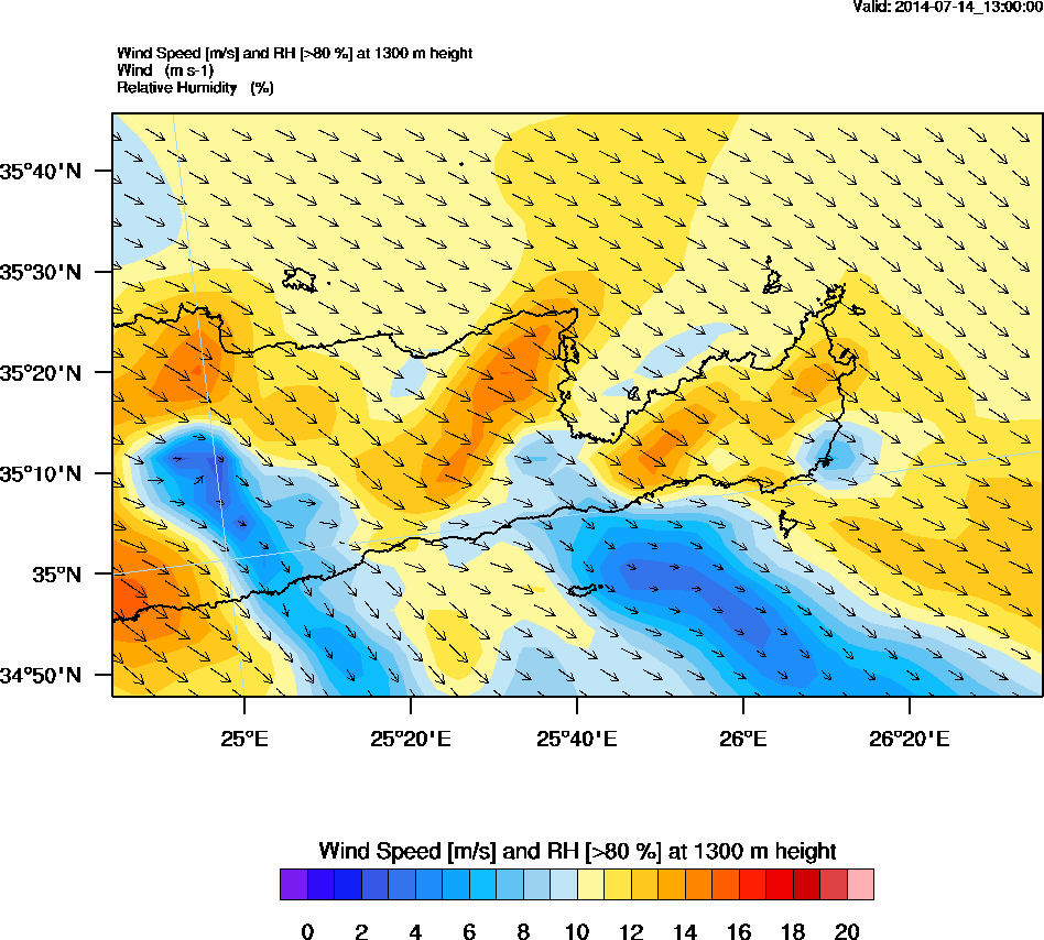 Graph 4: arw054.png - Wind Speed [m/s] and RH [>80%] at 1300 m height