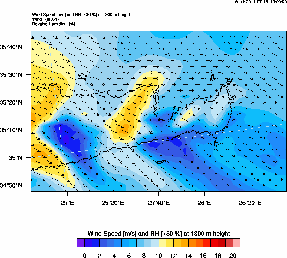 Graph 4: arw039.png - Wind Speed [m/s] and RH [>80%] at 1300 m height