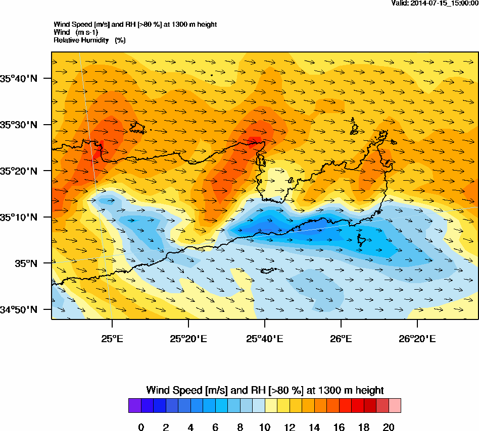 Graph 4: arw064.png - Wind Speed [m/s] and RH [>80%] at 1300 m height