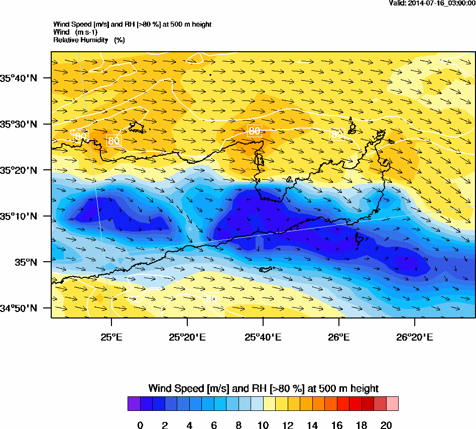 Graph 2: arw002.png - Wind Speed [m/s] and RH [>80%] at 500 m height