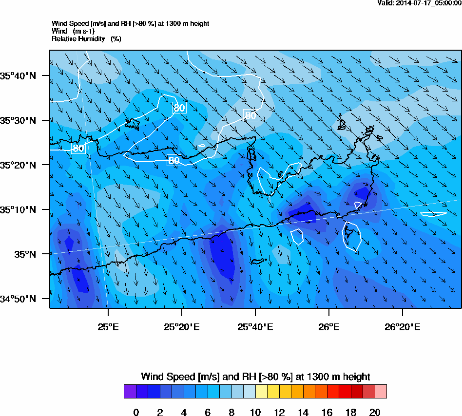 Graph 4: arw014.png - Wind Speed [m/s] and RH [>80%] at 1300 m height
