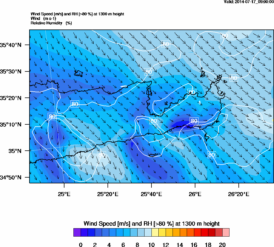 Graph 4: arw034.png - Wind Speed [m/s] and RH [>80%] at 1300 m height