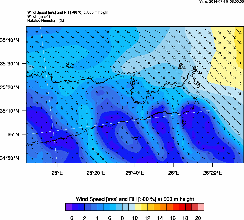 Graph 2: arw002.png - Wind Speed [m/s] and RH [>80%] at 500 m height