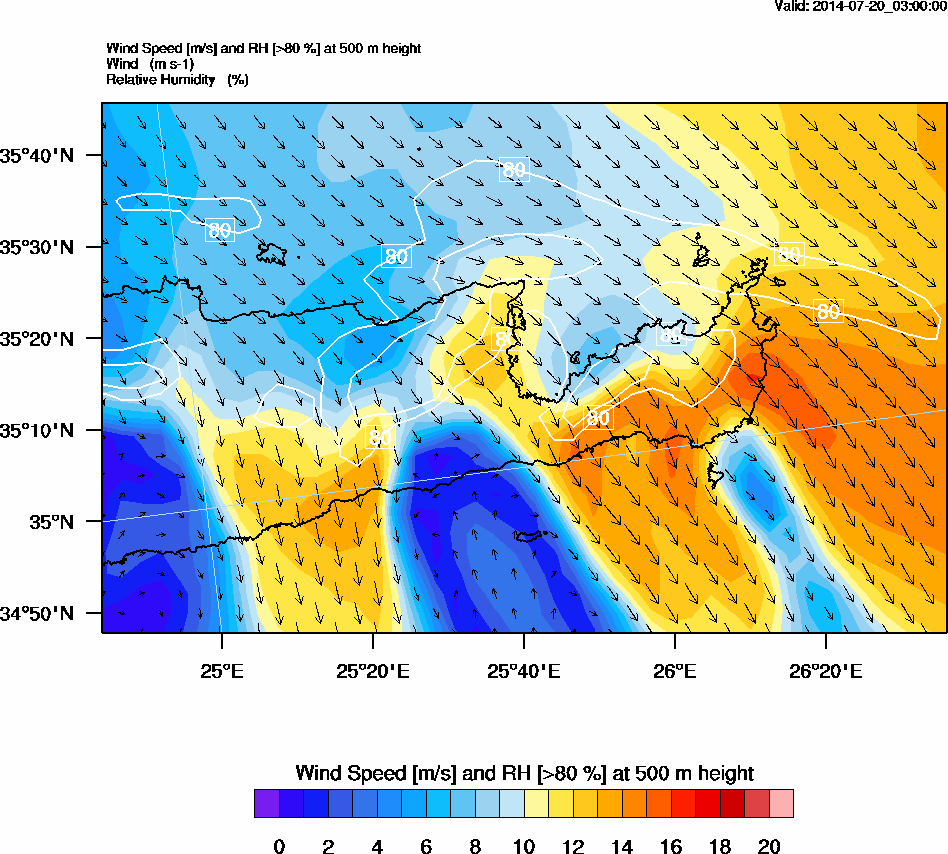 Graph 2: arw002.png - Wind Speed [m/s] and RH [>80%] at 500 m height