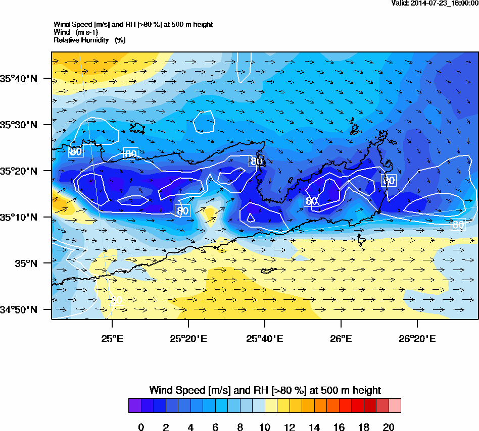 Graph 2: arw067.png - Wind Speed [m/s] and RH [>80%] at 500 m height