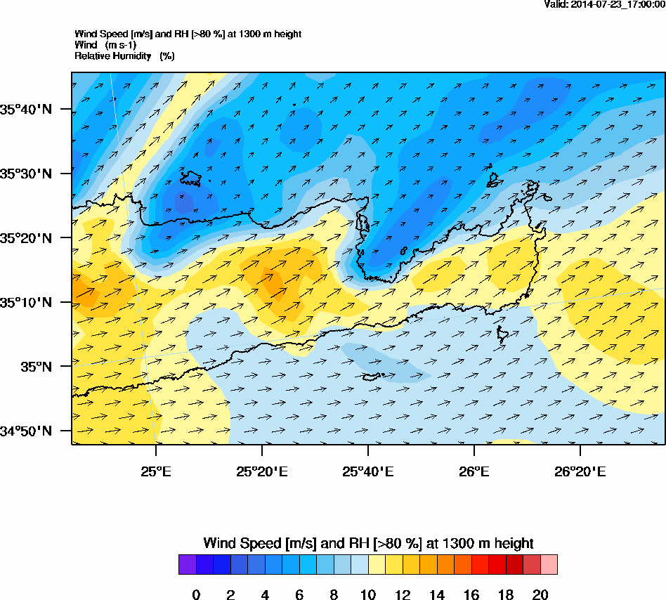 Graph 4: arw074.png - Wind Speed [m/s] and RH [>80%] at 1300 m height