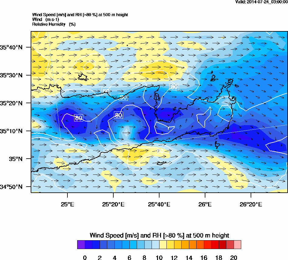 Graph 2: arw002.png - Wind Speed [m/s] and RH [>80%] at 500 m height