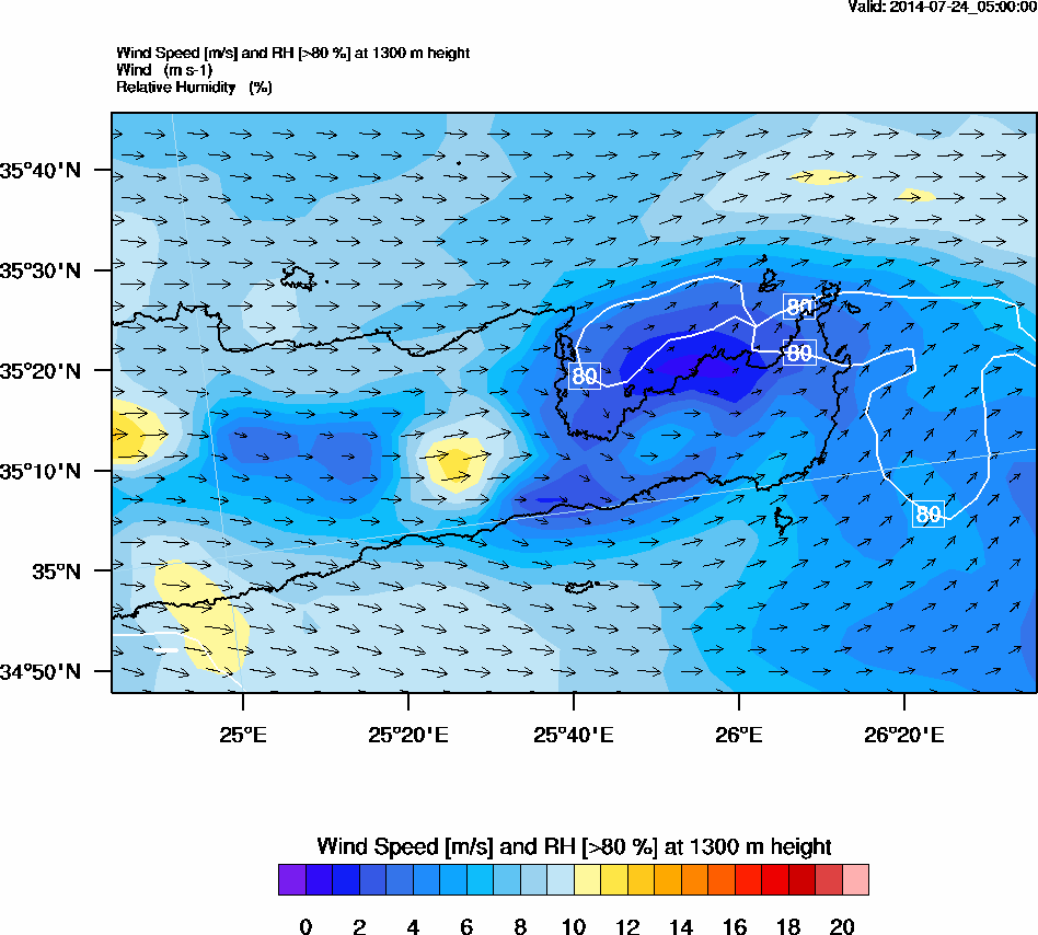 Graph 4: arw014.png - Wind Speed [m/s] and RH [>80%] at 1300 m height