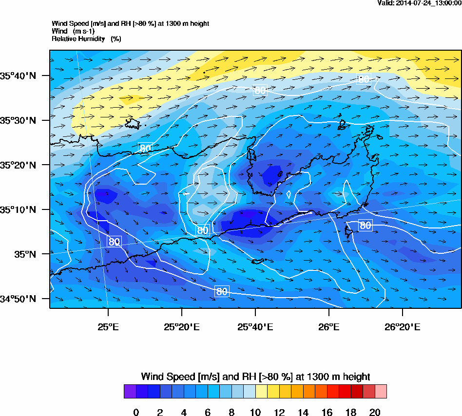 Graph 4: arw054.png - Wind Speed [m/s] and RH [>80%] at 1300 m height
