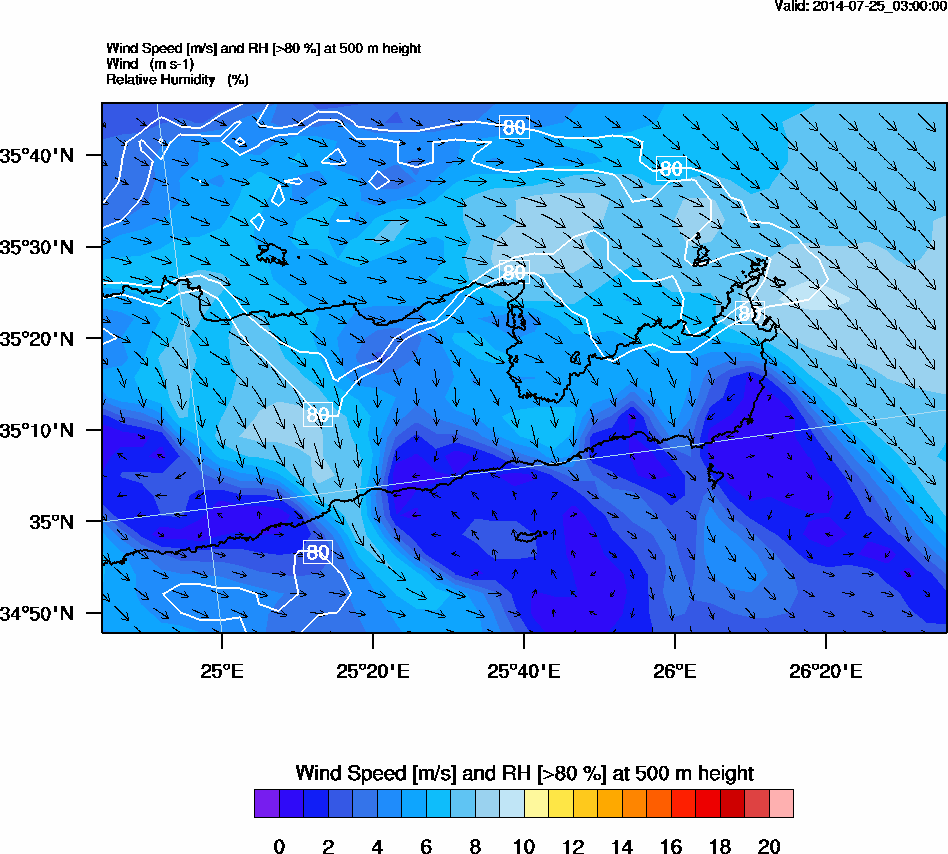 Graph 2: arw002.png - Wind Speed [m/s] and RH [>80%] at 500 m height