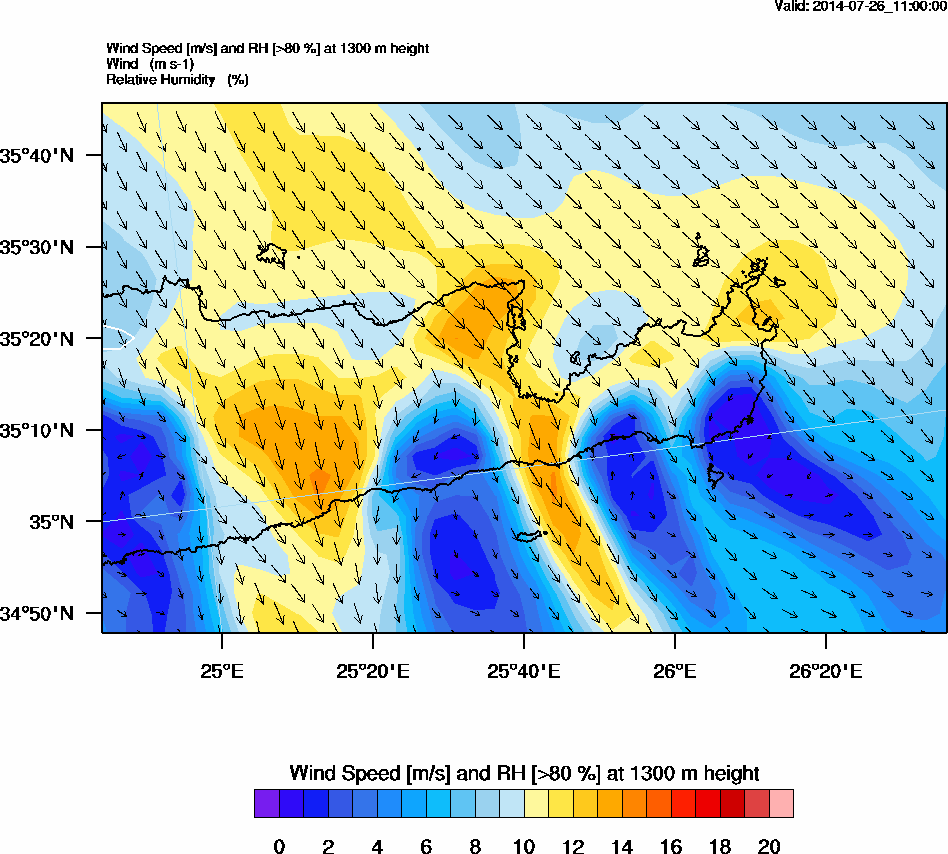Graph 4: arw044.png - Wind Speed [m/s] and RH [>80%] at 1300 m height