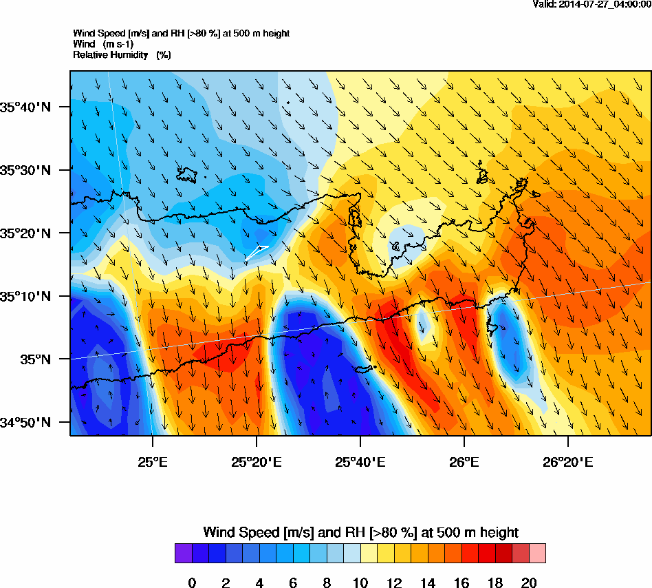 Graph 2: arw007.png - Wind Speed [m/s] and RH [>80%] at 500 m height