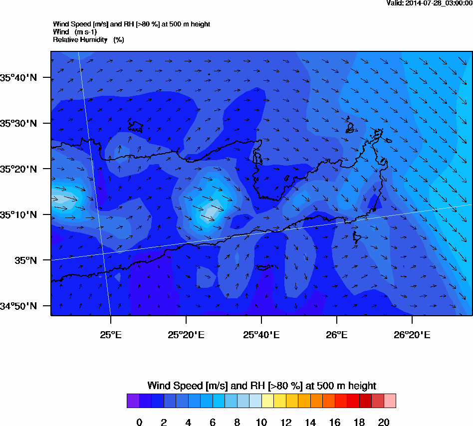 Graph 2: arw002.png - Wind Speed [m/s] and RH [>80%] at 500 m height