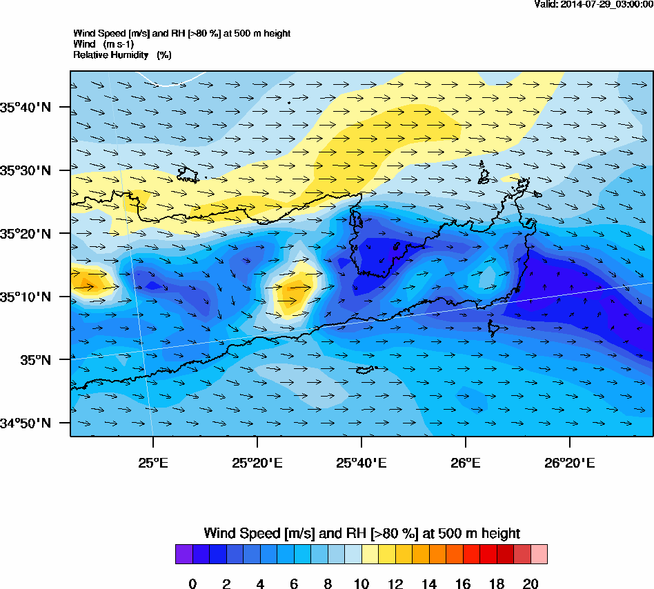 Graph 2: arw002.png - Wind Speed [m/s] and RH [>80%] at 500 m height