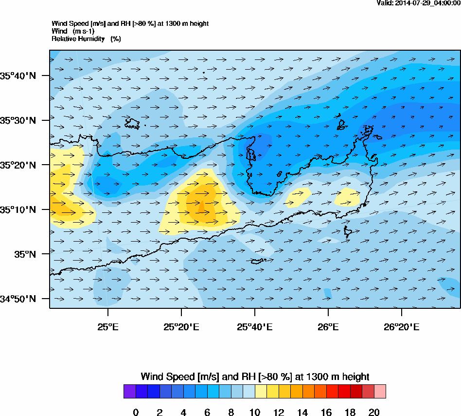 Graph 4: arw009.png - Wind Speed [m/s] and RH [>80%] at 1300 m height