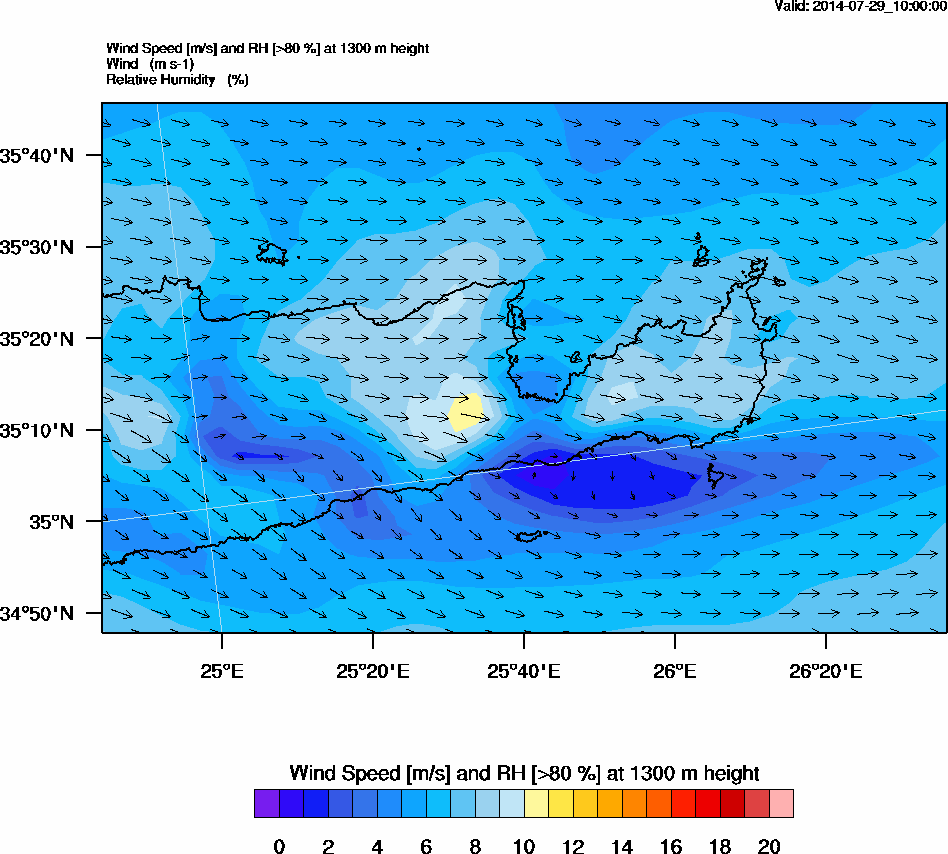 Graph 4: arw039.png - Wind Speed [m/s] and RH [>80%] at 1300 m height