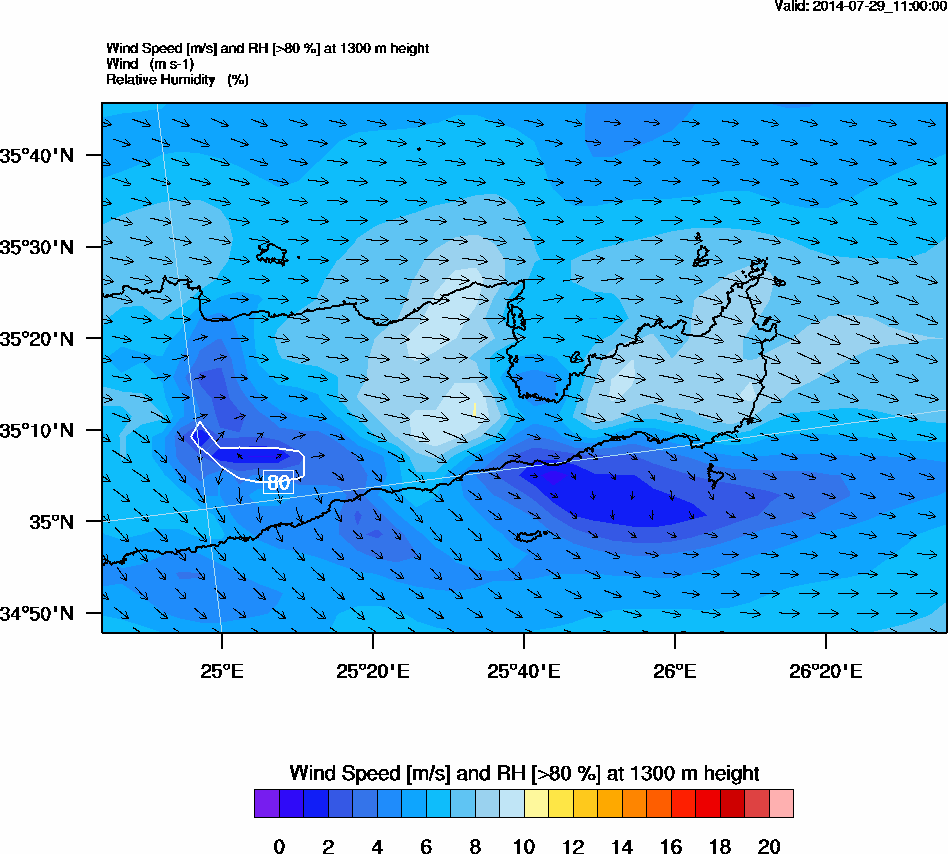 Graph 4: arw044.png - Wind Speed [m/s] and RH [>80%] at 1300 m height