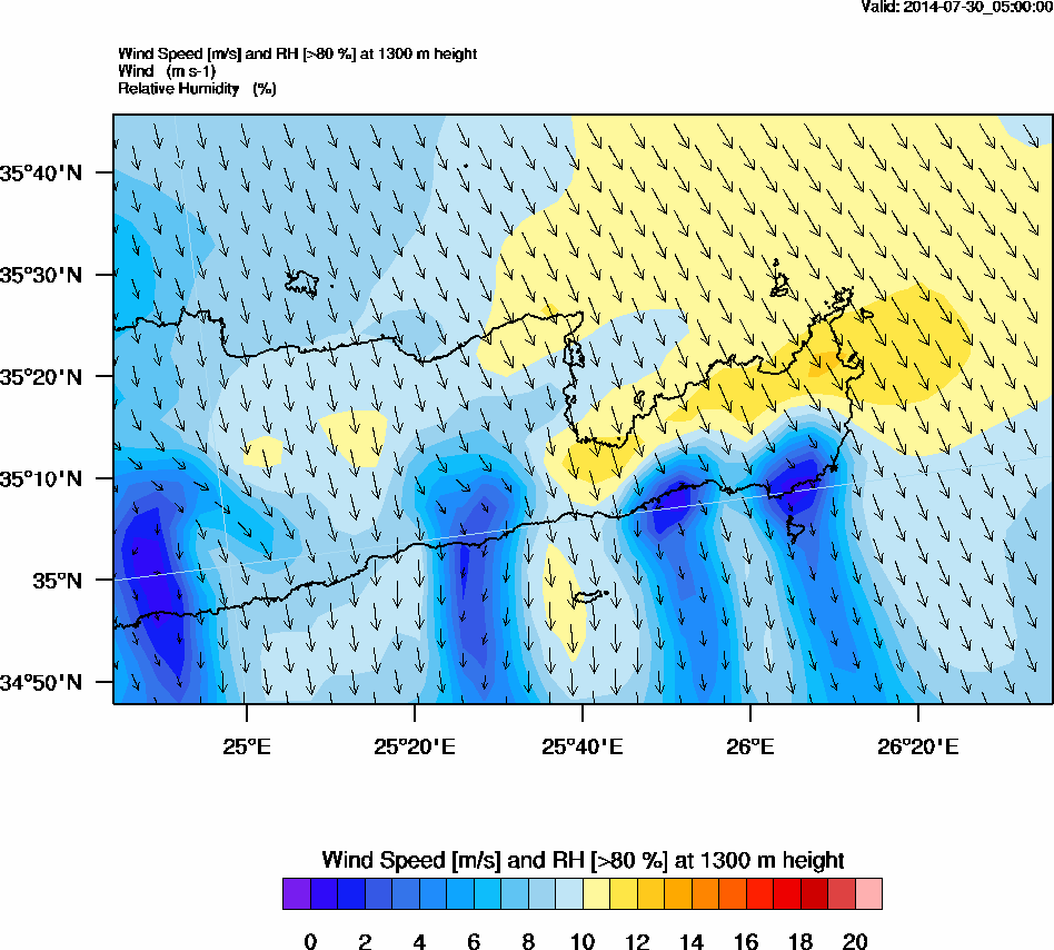 Graph 4: arw014.png - Wind Speed [m/s] and RH [>80%] at 1300 m height