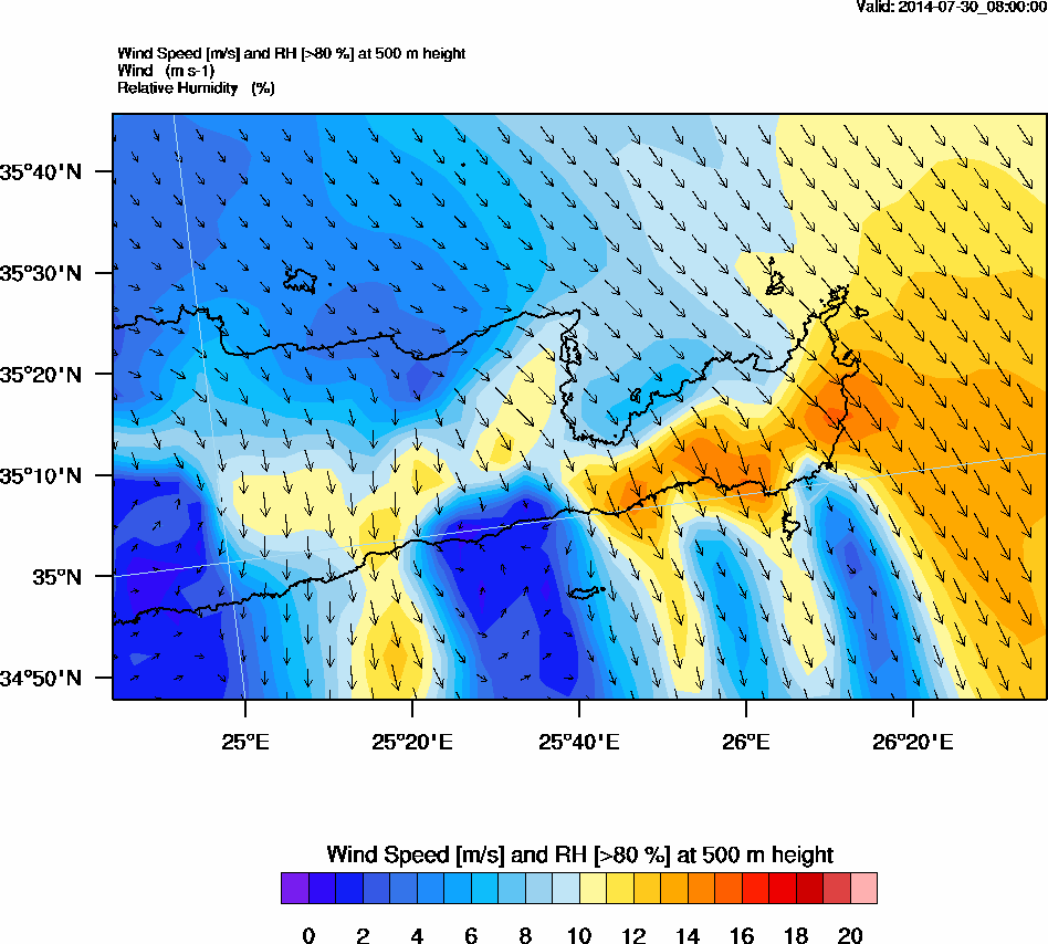 Graph 2: arw027.png - Wind Speed [m/s] and RH [>80%] at 500 m height