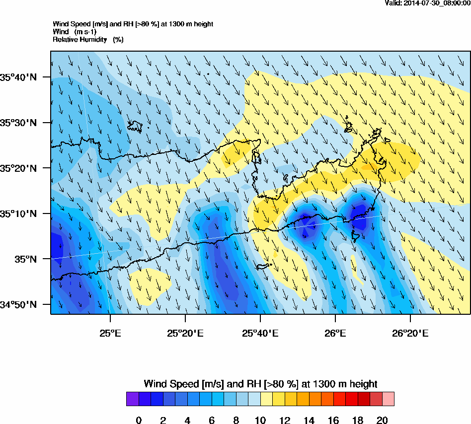 Graph 4: arw029.png - Wind Speed [m/s] and RH [>80%] at 1300 m height