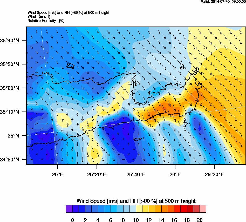 Graph 2: arw032.png - Wind Speed [m/s] and RH [>80%] at 500 m height