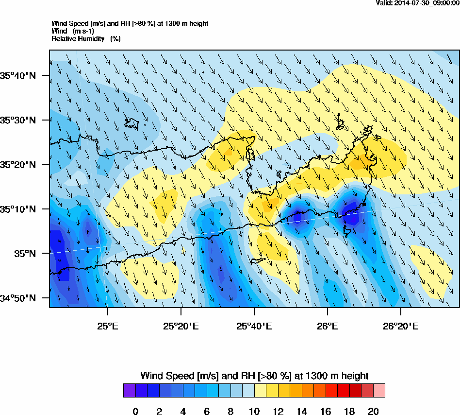Graph 4: arw034.png - Wind Speed [m/s] and RH [>80%] at 1300 m height