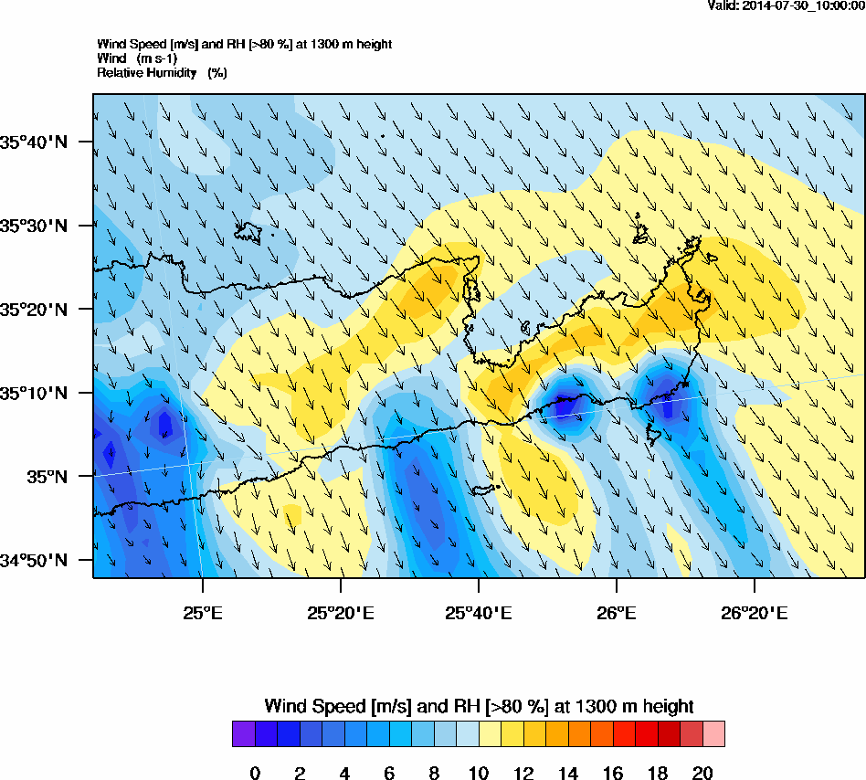 Graph 4: arw039.png - Wind Speed [m/s] and RH [>80%] at 1300 m height
