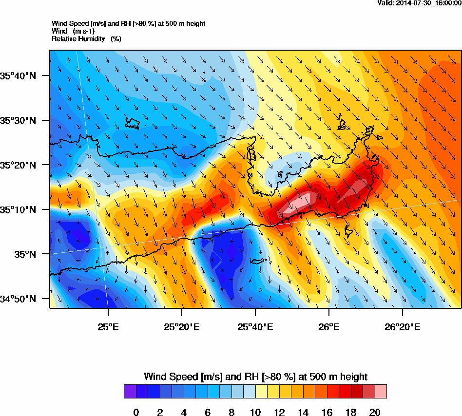 Graph 2: arw067.png - Wind Speed [m/s] and RH [>80%] at 500 m height