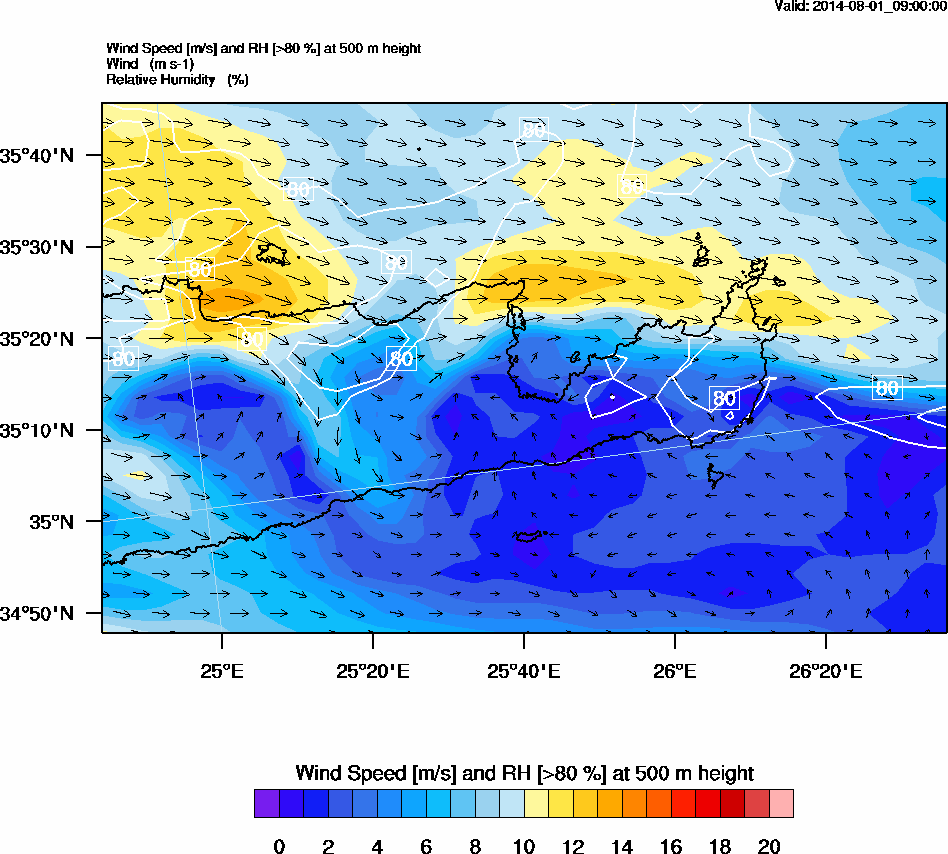 Graph 2: arw032.png - Wind Speed [m/s] and RH [>80%] at 500 m height