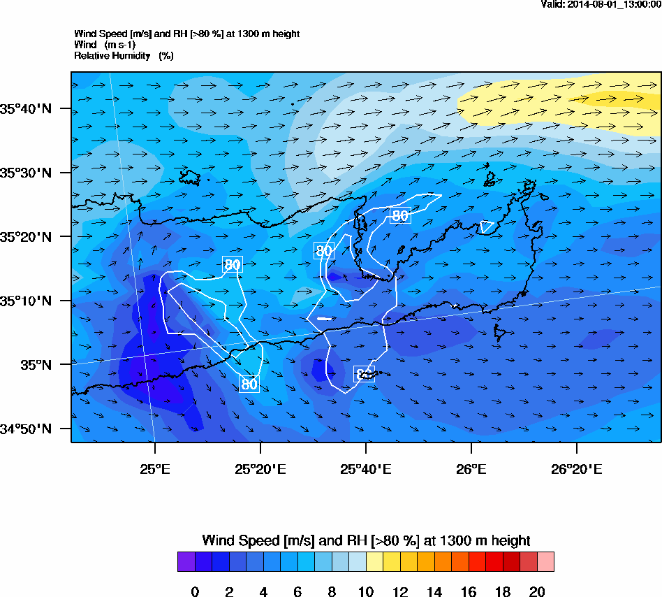 Graph 4: arw054.png - Wind Speed [m/s] and RH [>80%] at 1300 m height